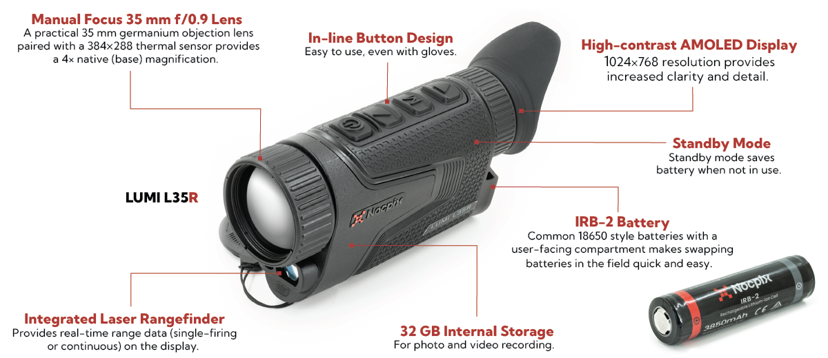 Discover the Nocpix LUMI Series—compact, versatile thermal monoculars built for hunters, landowners, and night-time explorers who demand performance without excess bulk. Designed for handheld use and easy carry, LUMI units deliver crisp thermal imaging in a streamlined form factor. Whether you're scouting a field, tracking predators, or scanning your property, the LUMI Series brings clarity to the dark. The powerful L35R—with its integrated rangefinder—is ideal for those who need precise distance readouts, while the L19 offers a lighter, fast-handling option. Both the L35R and the budget-friendly L19 are available exclusively in the U.S. at NocpixUSA.com.